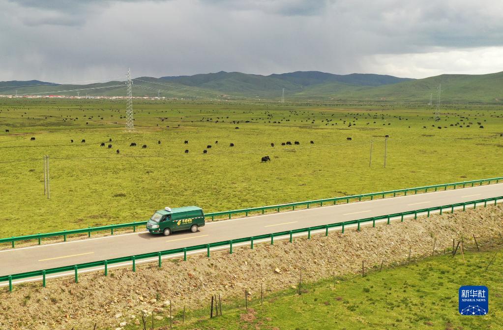 哈弄夺机开着邮车奔波在若尔盖大草原的邮路上,为农牧民提供服务(6月14日摄,无人机照片)。