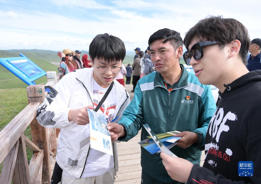 哈弄夺机(中)在若尔盖县黄河九曲第一湾景区向游客发放邮政明信片,宣传介绍当地旅游资源(6月15日摄)。