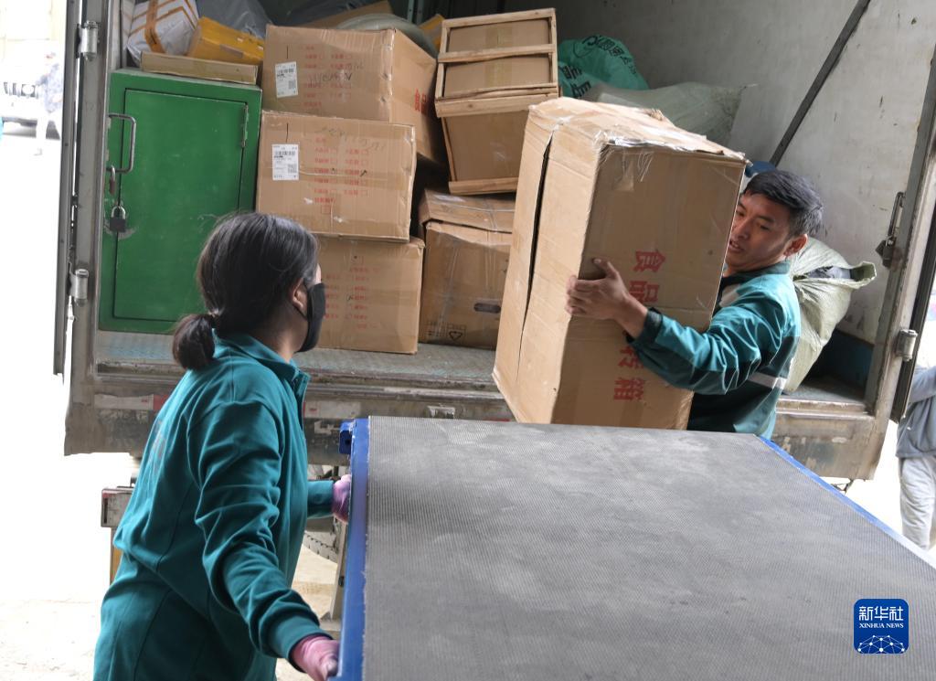 在唐克镇快递物流运营中心,哈弄夺机(右)和同事一起卸车(6月15日摄)。