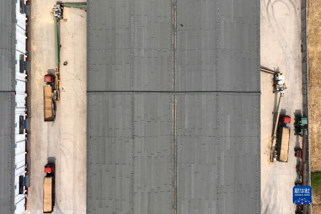 6月18日,在位于柏乡县的河北柏粮粮食储备集团有限公司,工人在卸载收购的小麦(无人机照片)。