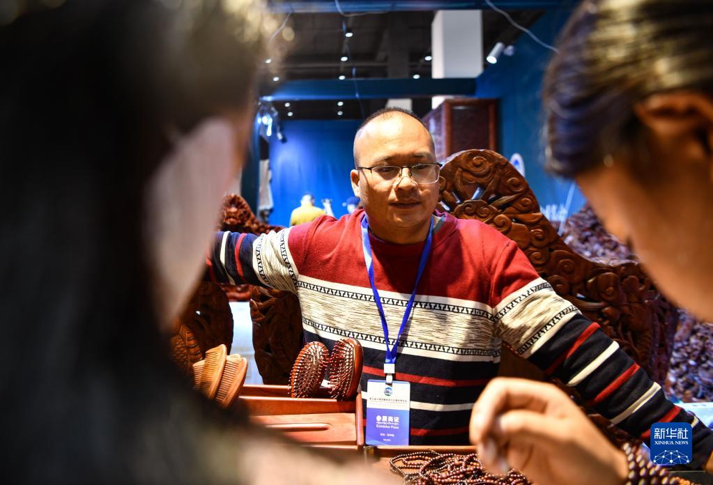 藏博会越南展位上的商人在销售越南特色商品(6月18日摄)。