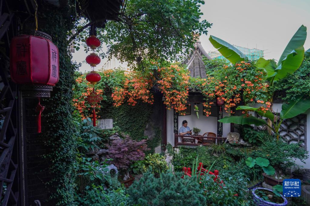 扬州市民杜祥开用自家平房与天井打造出“祥庐”,小桥流水,亭台假山,锦鱼畅游,匾额楹联(6月14日摄)。