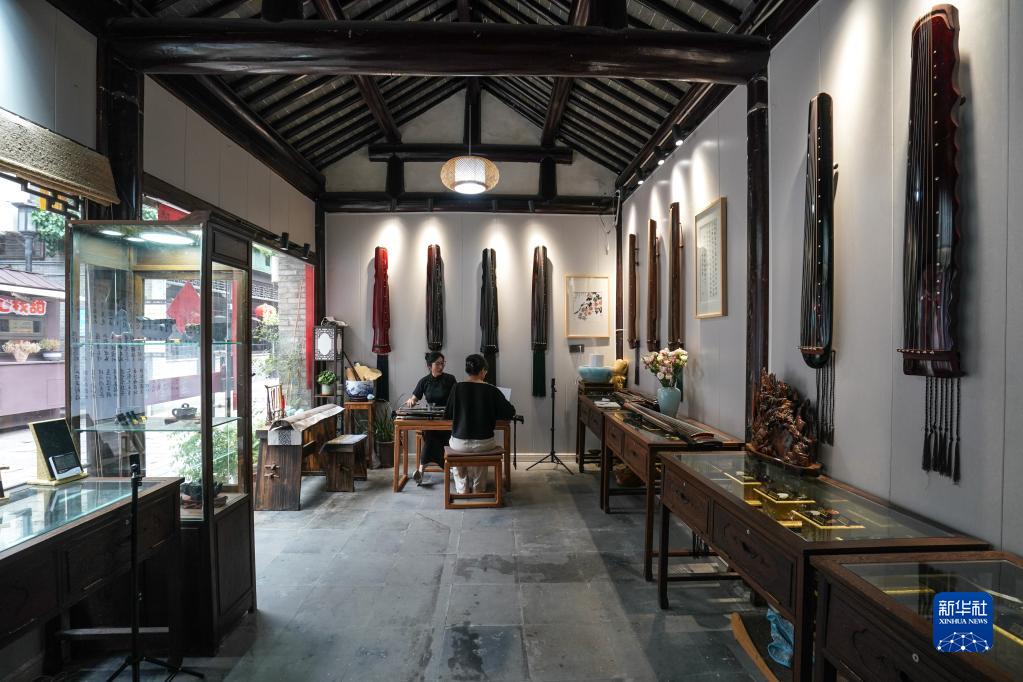 在扬州东关街的一家古琴行,一对师生在教学中(6月15日摄)。