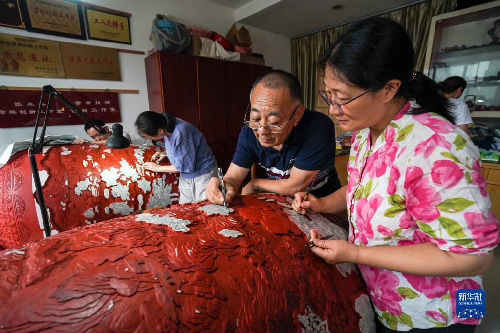 中国工艺美术大师张来喜(右二)在工作室与同事交流制作扬州红雕漆作品(6月15日摄)。
