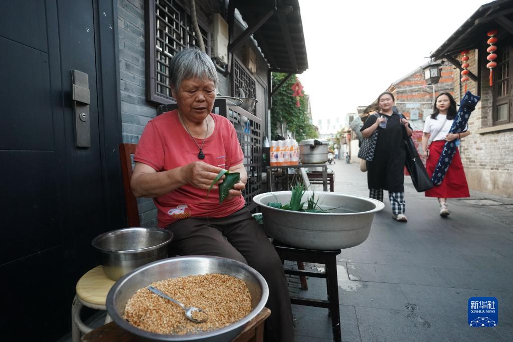 居民在扬州仁丰里包粽子(6月14日摄)。