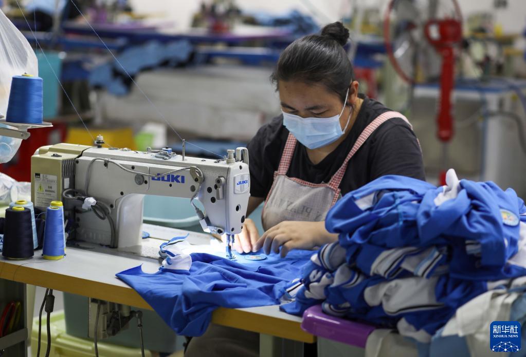 6月19日,村民在贵州省剑河县幸福社区帮扶车间加工校服。