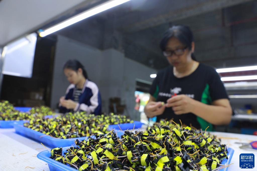 6月19日,村民在贵州省剑河县思源社区帮扶车间加工微型变压器。