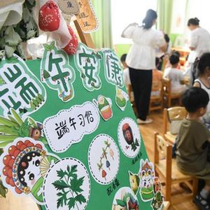 6月19日,在河北省邯郸市广平县第四幼儿园,小朋友在家长的帮助下学习包粽子。
