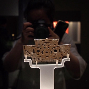 6月19日,来宾在拍摄展出的浙江余杭反山遗址16号墓出土的透雕玉冠状器。