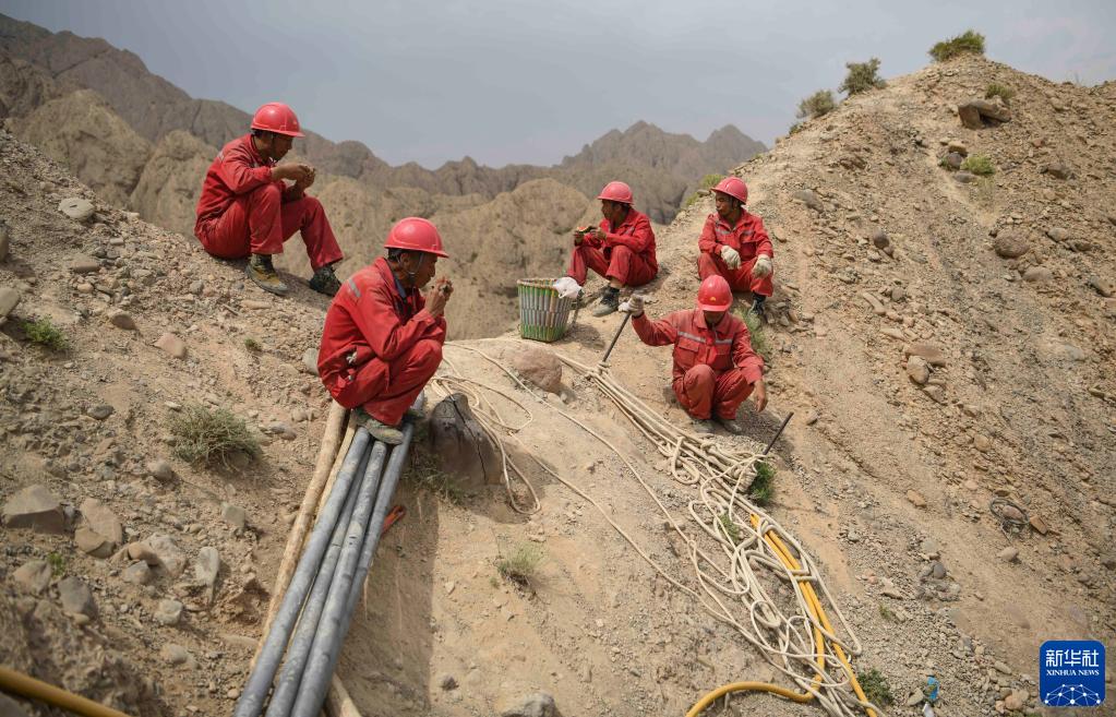 耗时约3个小时将全部钻井设备搬过一处崖壁后,东方物探公司塔里木物探处2170队的工人坐在崖壁上休息(6月18日摄)。新华社记者 胡虎虎 摄