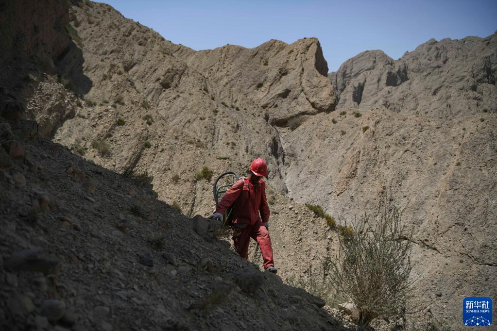 东方物探公司塔里木物探处2170队的钻工张堂红背着钻井设备翻越山坡,前往下一个钻井点位(6月18日摄)。新华社记者 胡虎虎 摄