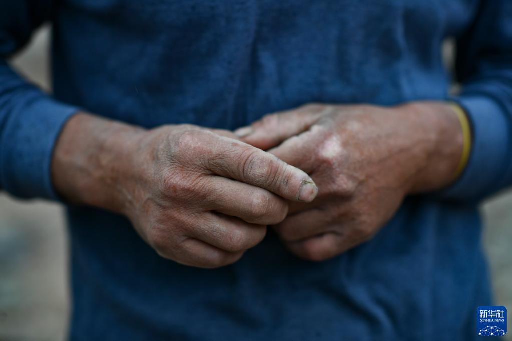 这是在营地拍摄的东方物探公司塔里木物探处2170队司钻李事全的双手(6月18日摄)。钻井机运转期间,李事全作为司钻,须寸步不离守护、操作设备。新华社记者 胡虎虎 摄