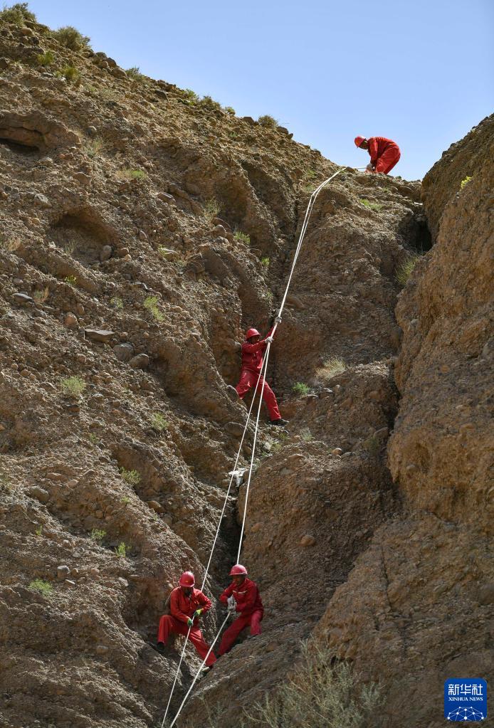 东方物探公司塔里木物探处2170队的钻工们借助绳索搬运钻井设备,翻越一处落差约30米的崖壁(6月18日摄)。新华社记者 胡虎虎 摄