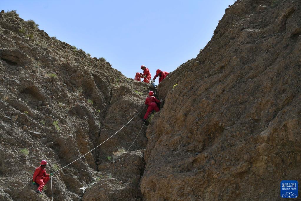 东方物探公司塔里木物探处2170队的钻工们借助绳索搬运钻井设备,翻越一处落差约30米的崖壁(6月18日摄)。新华社记者 胡虎虎 摄