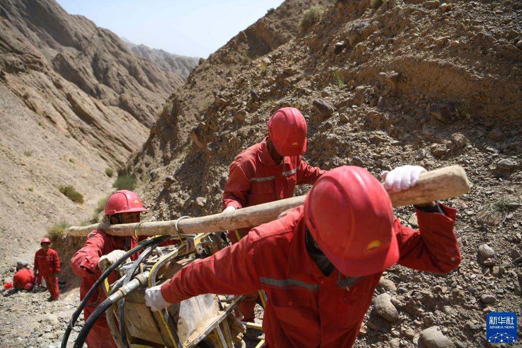 东方物探公司塔里木物探处2170队的钻工们沿着羊肠小道在山坡上搬运拆解后的钻井设备(6月18日摄)。拆解后的设备最重的仍有约200斤。新华社记者 胡虎虎 摄