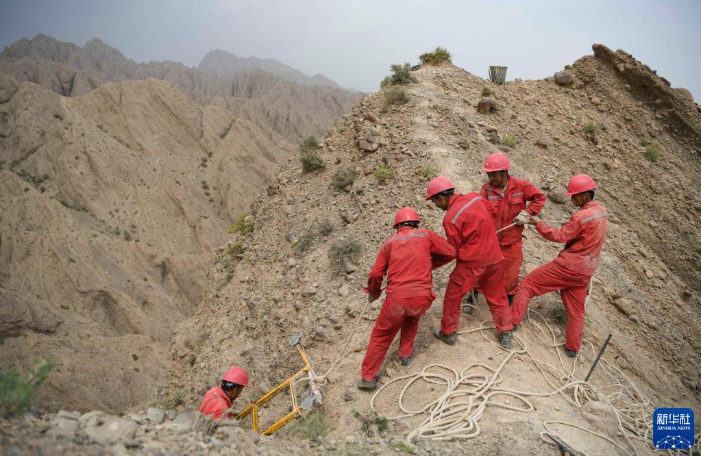 东方物探公司塔里木物探处2170队的钻工们合力将钻井设备从山谷运送到崖壁之上(6月18日摄)。新华社记者 胡虎虎 摄