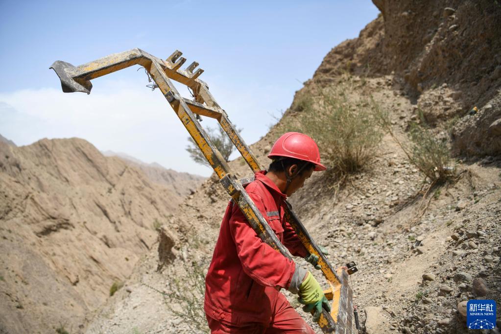 东方物探公司塔里木物探处2170队33岁的钻工谭金龙在峭壁上搬运钻井设备(6月18日摄)。新华社记者 胡虎虎 摄