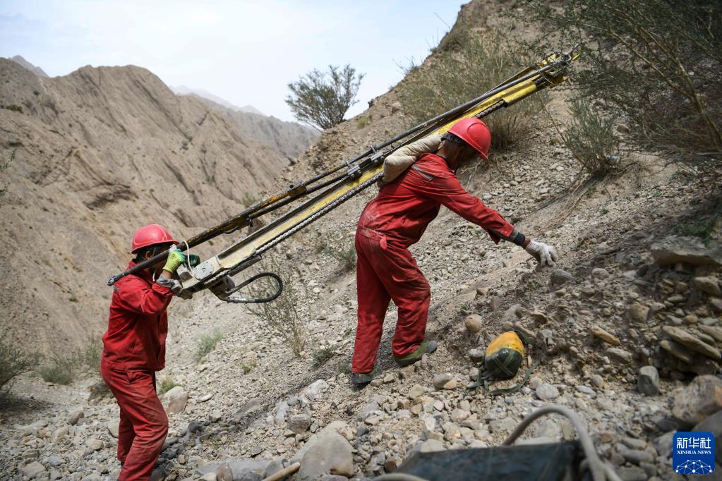 东方物探公司塔里木物探处2170队59岁的钻工马维海(前)和工友扛着钻井设备爬陡坡(6月18日摄)。新华社记者 胡虎虎 摄