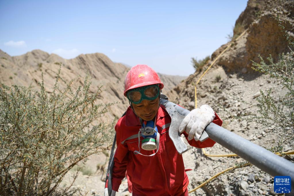 东方物探公司塔里木物探处2170队钻井组的司钻李事全扛着设备前往钻井点位(6月18日摄)。新华社记者 胡虎虎 摄