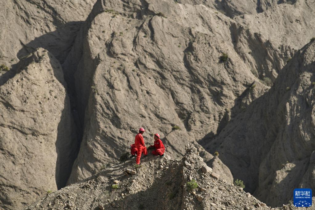 东方物探公司塔里木物探处2170队的钻工们在一处陡峭的山梁上休息(6月18日摄)。新华社记者 胡虎虎 摄