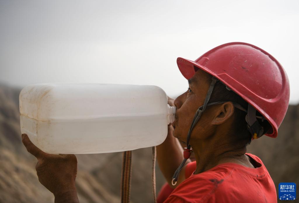 东方物探公司塔里木物探处2170队的钻工在山间休息时喝水(6月18日摄)。新华社记者 胡虎虎 摄