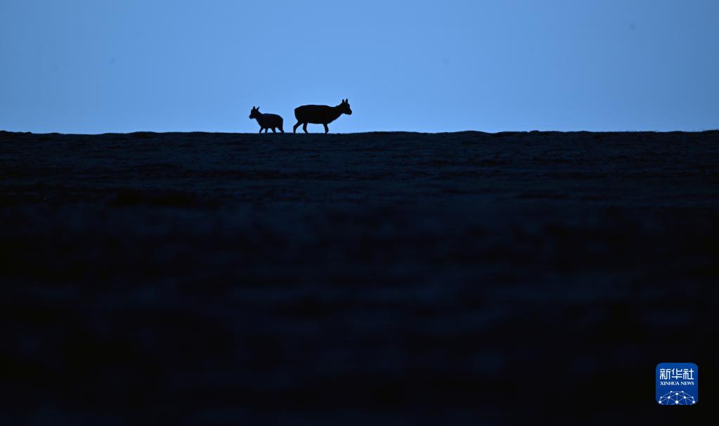两只藏羚羊在可可西里卓乃湖区域活动(6月18日摄)。