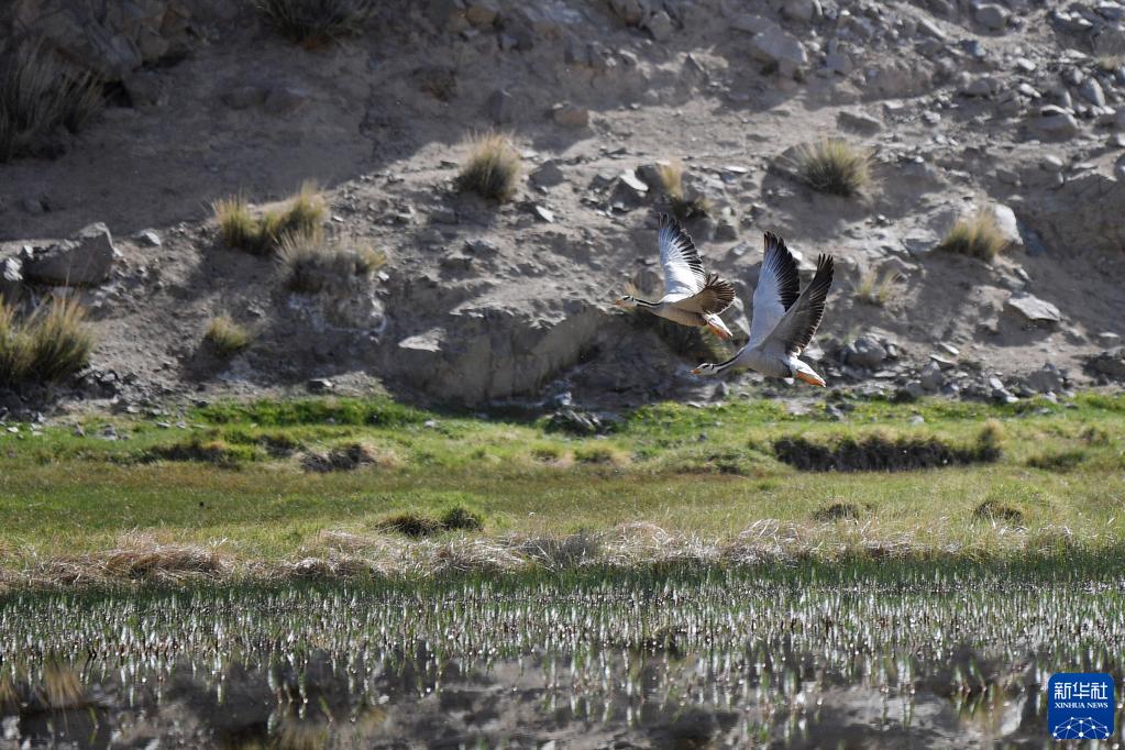 两只斑头雁在盐池湾湿地飞翔(6月20日摄)。