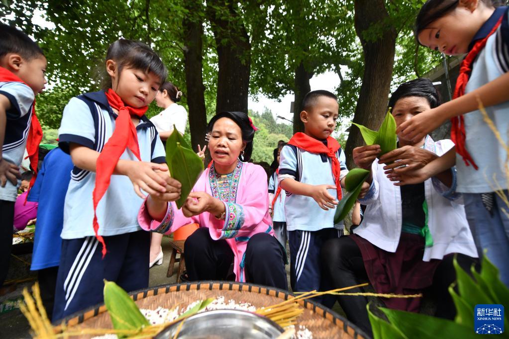 当日,广西融水苗族自治县在杆洞乡党鸠村举办“民族团结‘粽’有情”传统文化进校园主题活动,通过包粽子、学习端午文化等,让孩子们感受中华优秀传统文化的魅力。