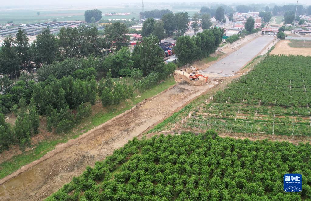 6月20日,工人在河北省卢龙县木井镇境内的龙凤河水生态治理工程工地施工(无人机照片)。
