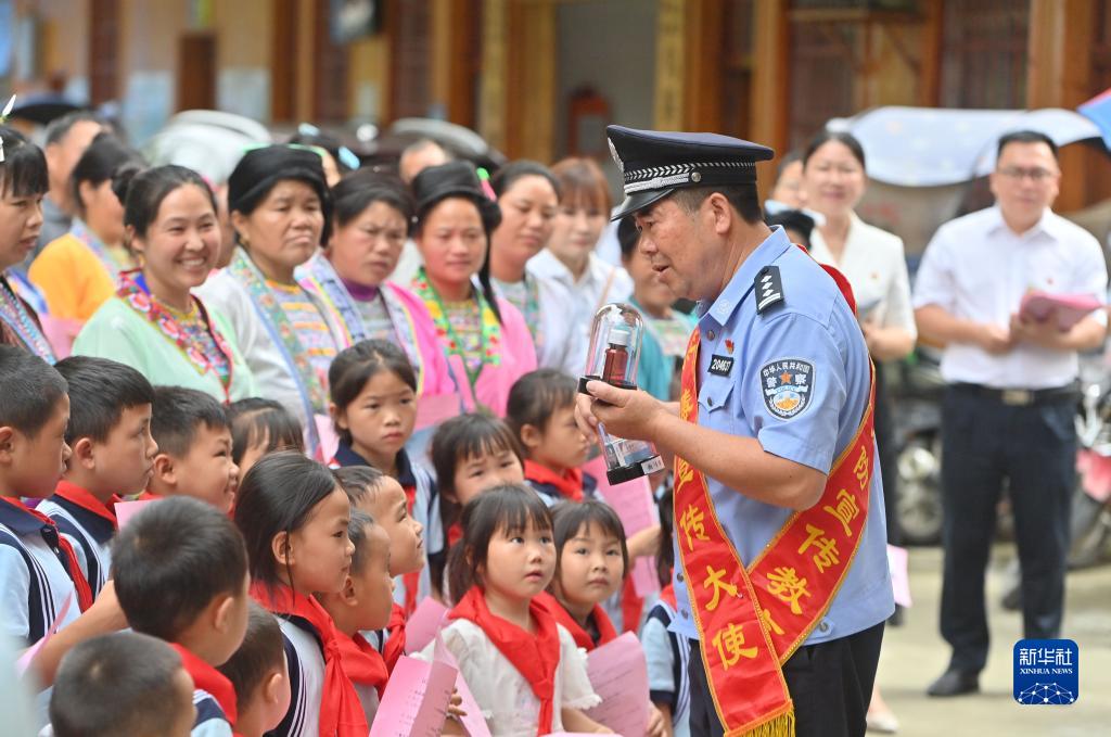 6月20日,在广西融水苗族自治县杆洞乡乌英苗寨,民警介绍禁毒知识。