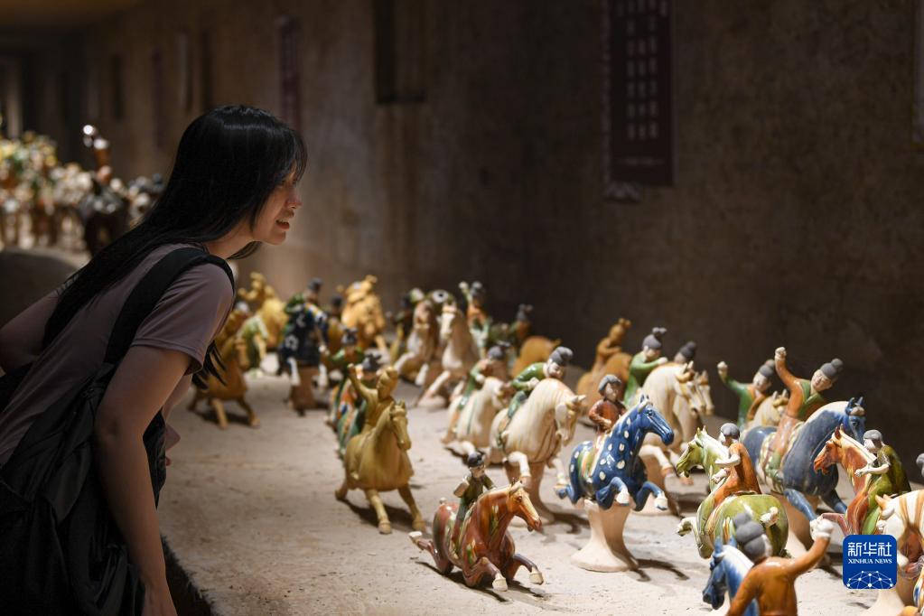 2023年6月6日,游客在洛阳市朝阳镇南石山村的唐三彩作品陈列展示馆内参观。