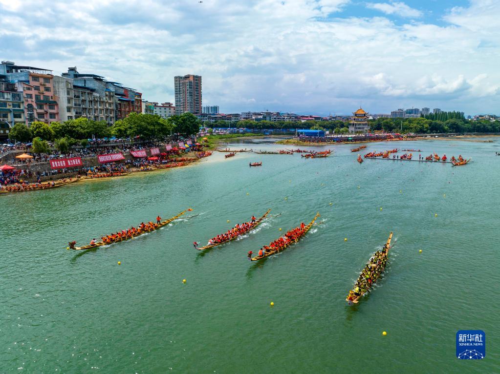 6月20日,龙船队在湖南道县潇水河上竞渡(无人机照片)。