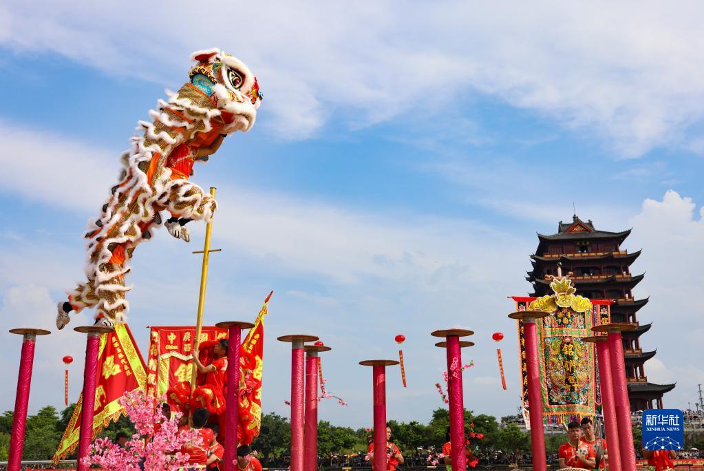 6月20日,在广西玉林园博园,演员进行舞狮表演。