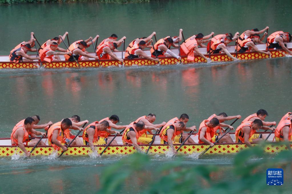 6月20日,选手们参加湖南省涟源市桥头河镇群众龙舟赛。