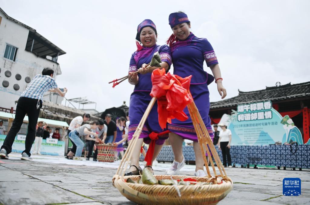 6月20日,在广西罗城仫佬族自治县东门镇石围古村,群众代表参加抢粽子比赛。