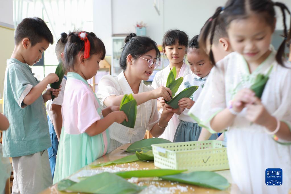 6月20日,在贵州省黔东南苗族侗族自治州岑巩县第二幼儿园,老师在教小朋友包粽子。