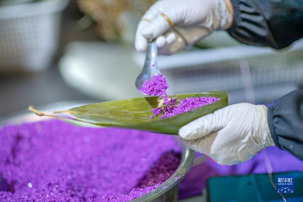 6月18日,在云南省文山壮族苗族自治州丘北县一食品加工企业,工人在制作五色粽子。