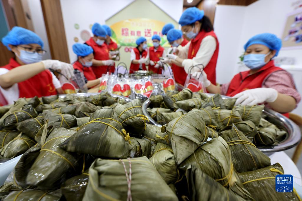 6月18日,在山东省枣庄市市中区总工会“户外劳动者驿站”,工会志愿者为户外劳动者包粽子。