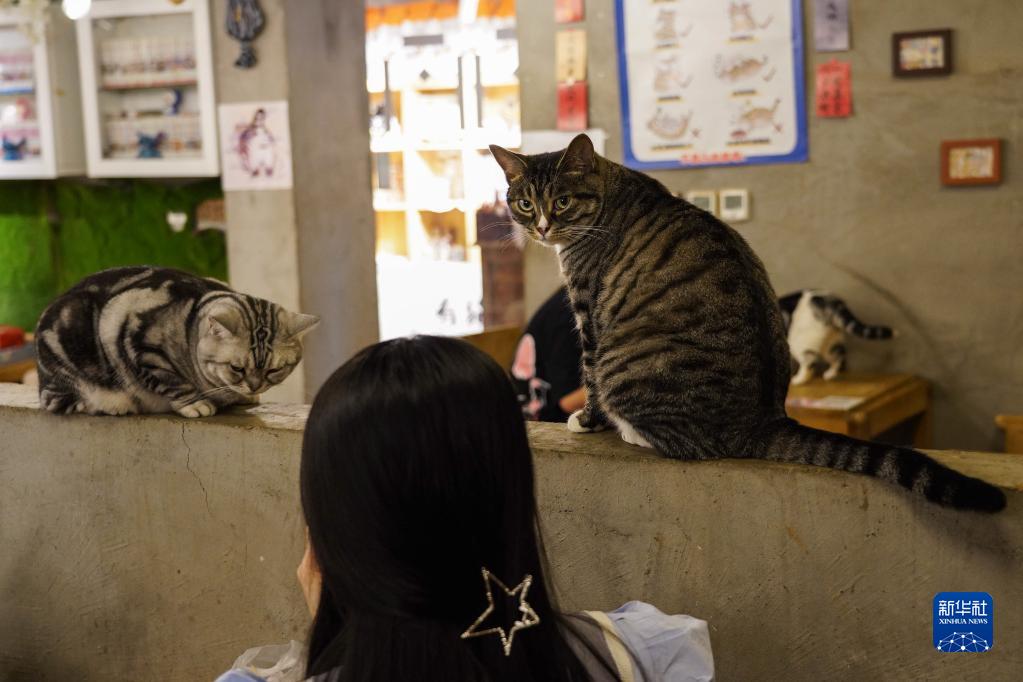 顾客与猫咪“小小美”(左)和“故知”互动(6月19日摄)。