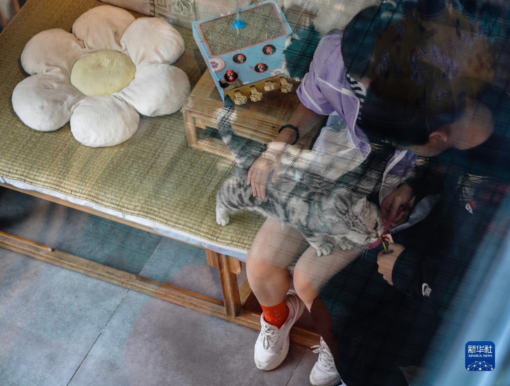 顾客给猫咪“尾牙”喂食(6月7日摄)。