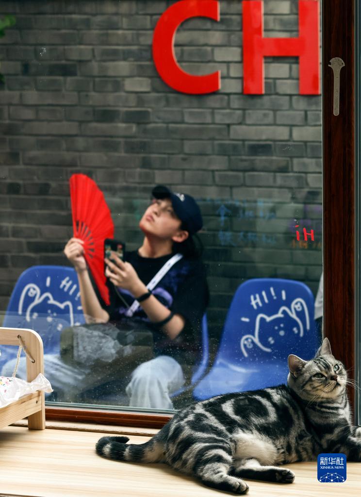 窗户内外,路人和猫咪各有所思(6月7日摄)。这只猫咪名叫“大福”,是店内“福禄寿喜”四猫之一。