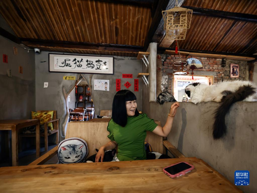 店主“于小猫”和猫咪在一起(6月7日摄)。