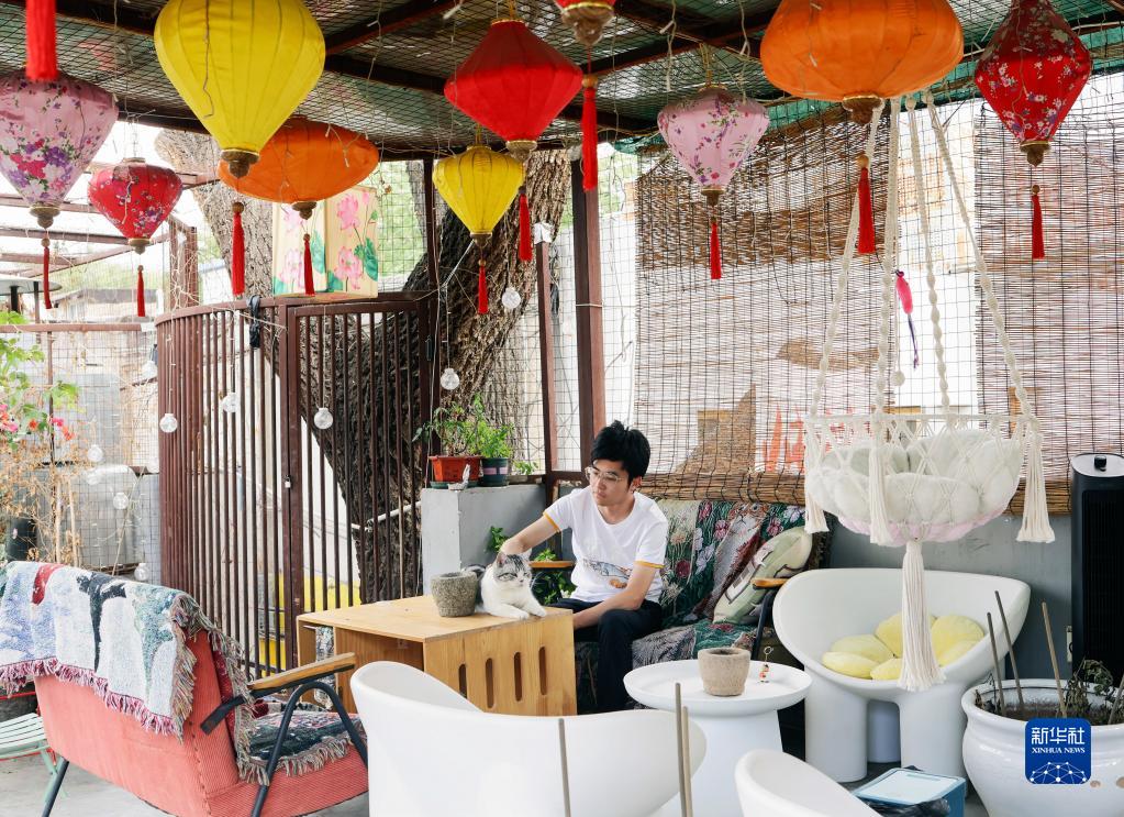顾客与猫咪“通宝”互动(6月10日摄)。