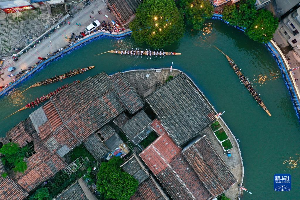 福州市长乐区三溪村,龙舟在穿村而过的小溪中竞渡迎端午(6月18日摄,无人机照片)。