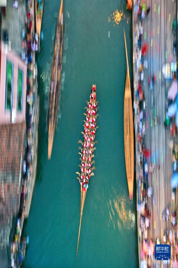 福州市长乐区三溪村,龙舟在穿村而过的小溪中竞渡迎端午(6月18日摄,无人机照片)。