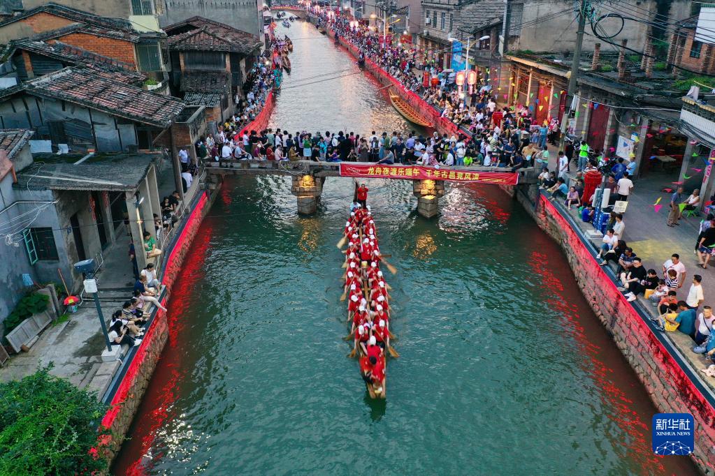 福州市长乐区三溪村,龙舟在穿村而过的小溪中竞渡迎端午(6月18日摄,无人机照片)。