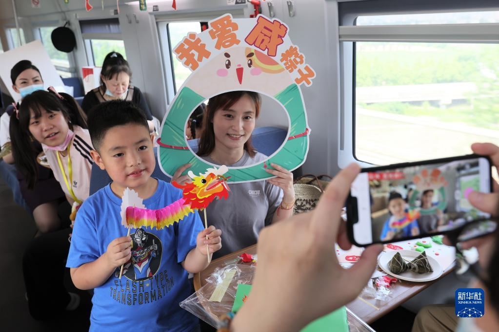 端午节前夕,铁路上海客运段在列车上邀请旅客参加端午民俗活动,迎接端午佳节。