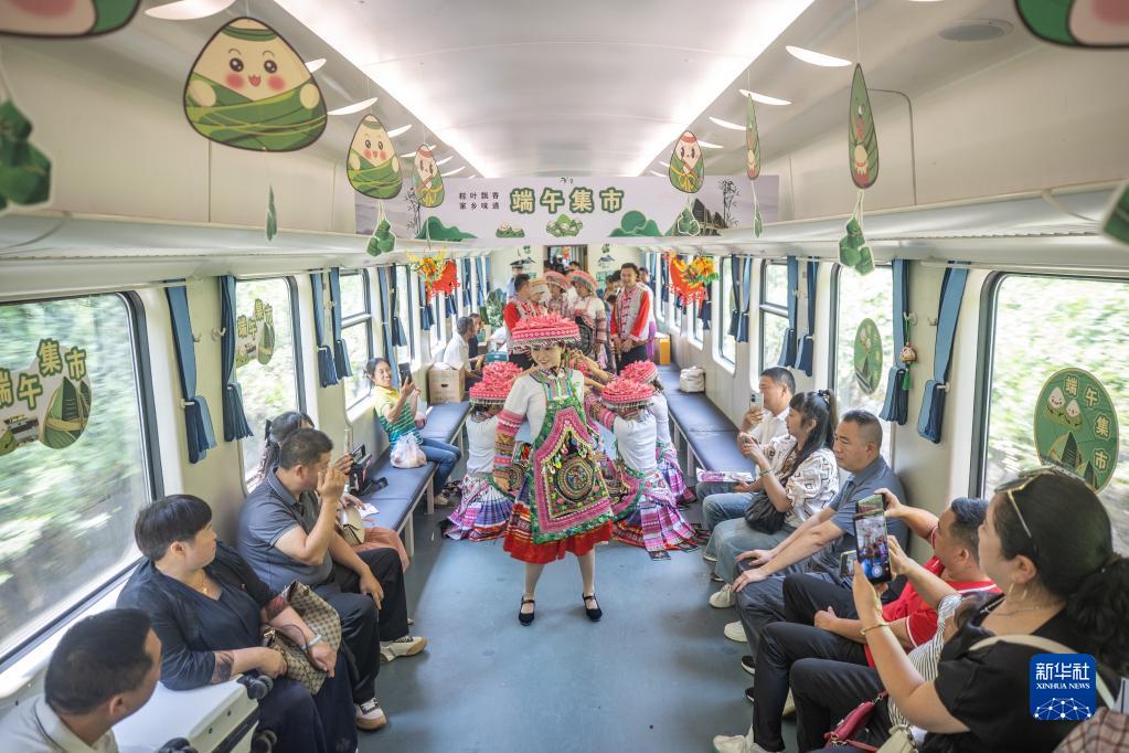 端午小长假来临之际,一辆载着300余名旅客的5630次列车从遵义站缓缓驶出,前往重庆西站。与之前搭乘的“慢火车”不同的是,旅客乘坐该趟列车,不仅可欣赏沿途各地的风景,还能在列车上逛“集市”、看节目、包粽子,在旅途中体验别样的端午民俗。