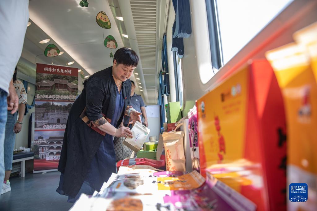 在“集市车厢”里,沿线村民将自家种的粽叶、艾草、菖蒲、糯米、蔬菜等农产品整齐摆放,供乘车旅客选择购买。逛完“集市”,在“民俗体验”车厢,旅客还可欣赏民族特色舞蹈、古筝弹奏、吉他弹唱等节目,亲手制作粽子及艾草香包,体验传统文化民俗。