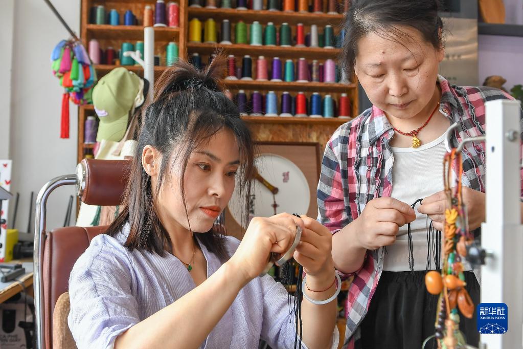 6月20日,在吉林省长春市,徐晓雪(左)与团队成员编绳结工艺品。